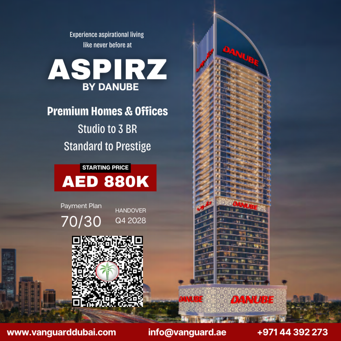 Aspirz by Danube is an iconic mixed-use tower in Dubai, thoughtfully designed to combine residential and commercial spaces in one dynamic address. Blending modern architecture with world-class amenities, it offers an elevated lifestyle and a thriving business hub under one roof.